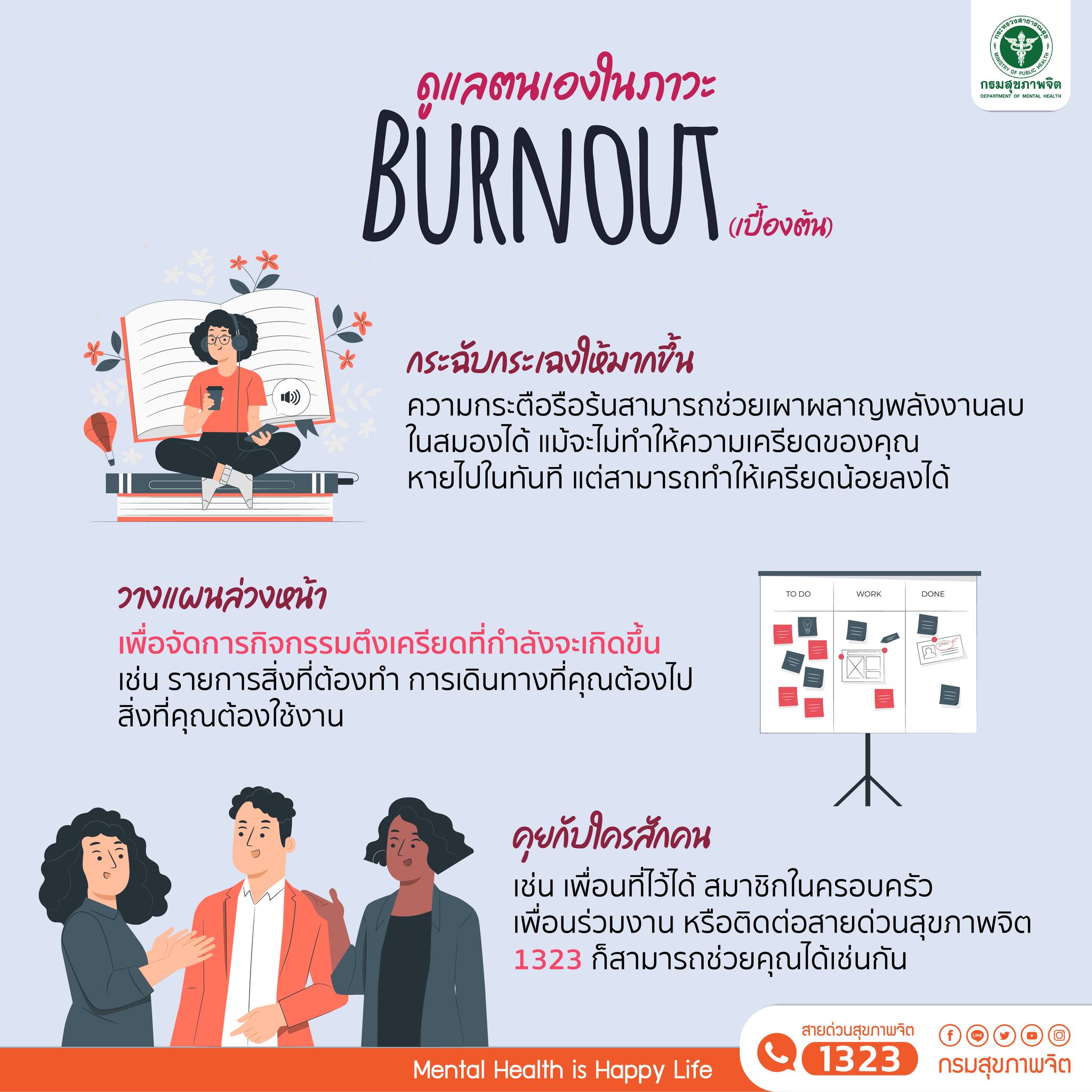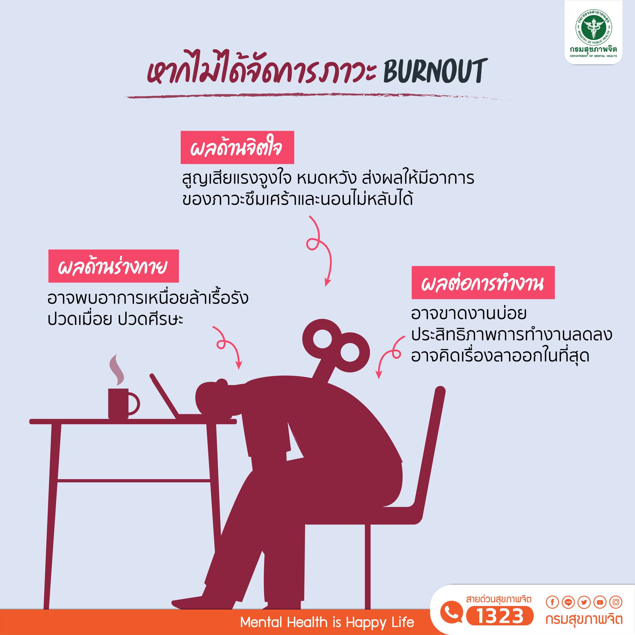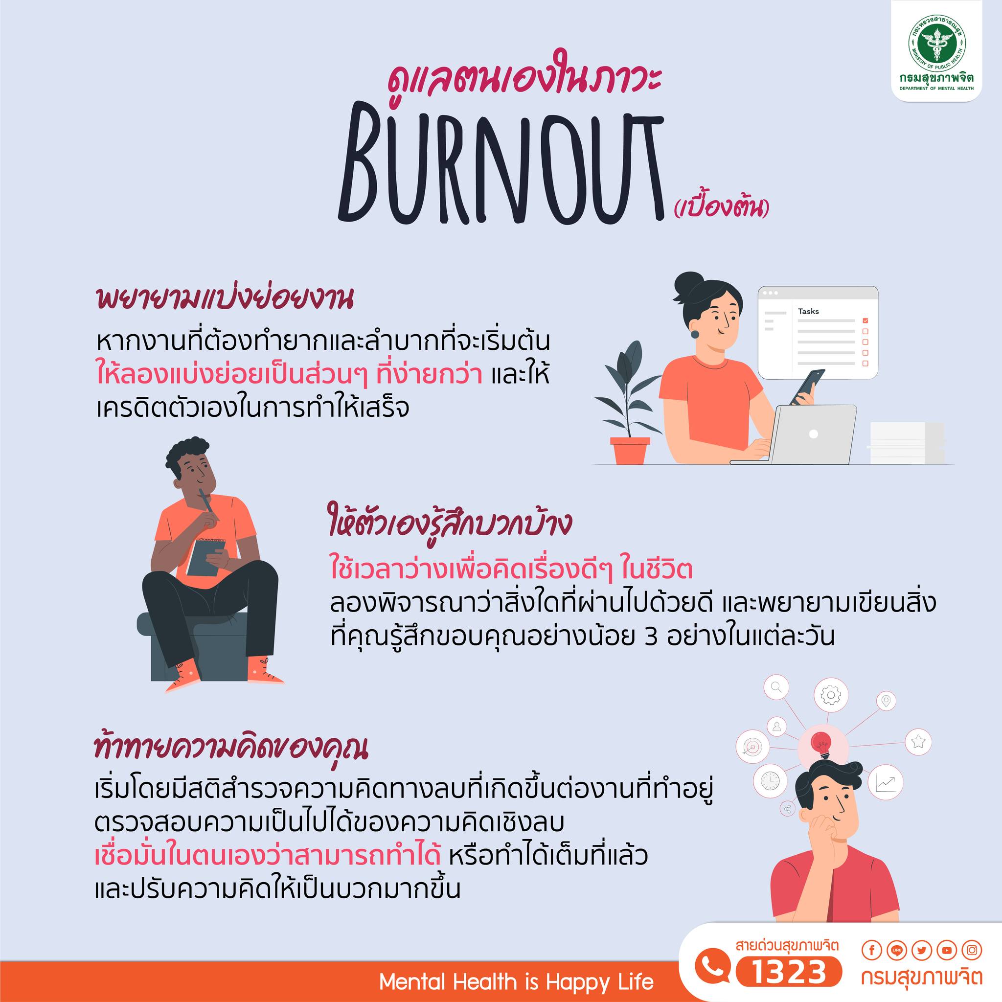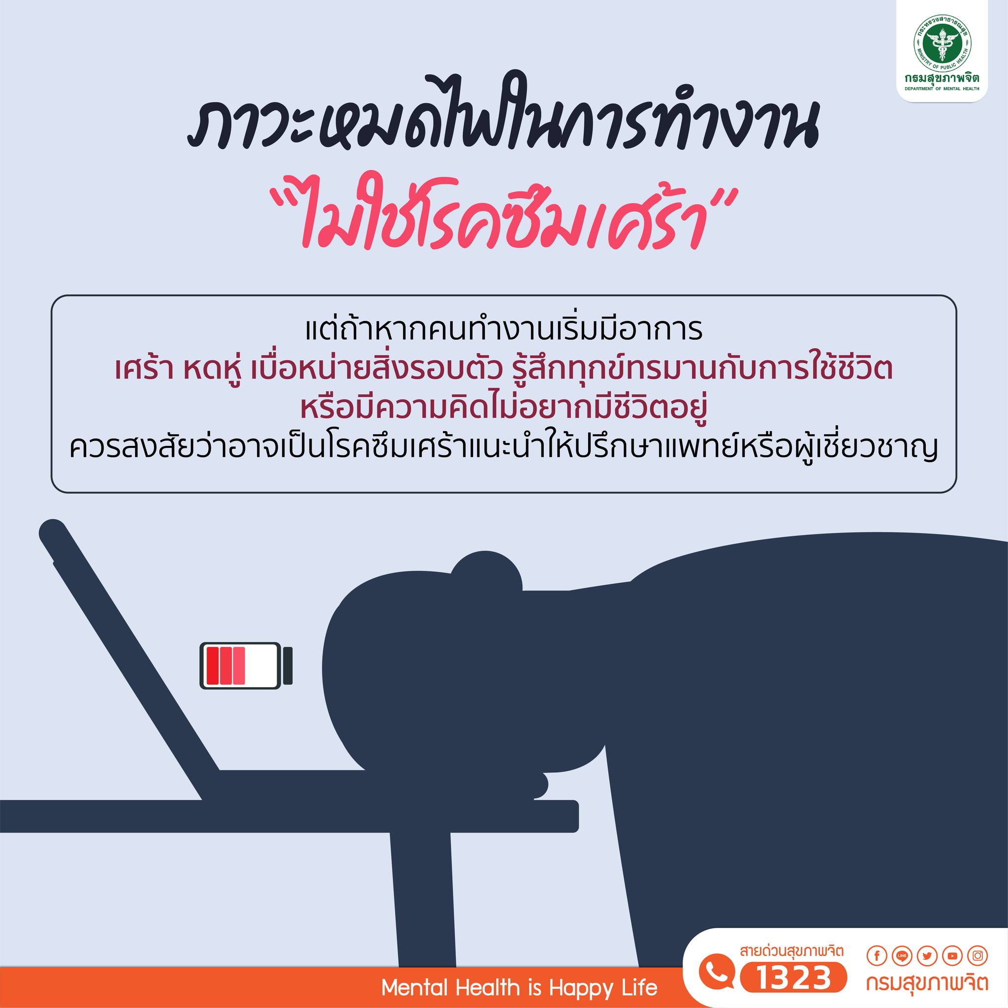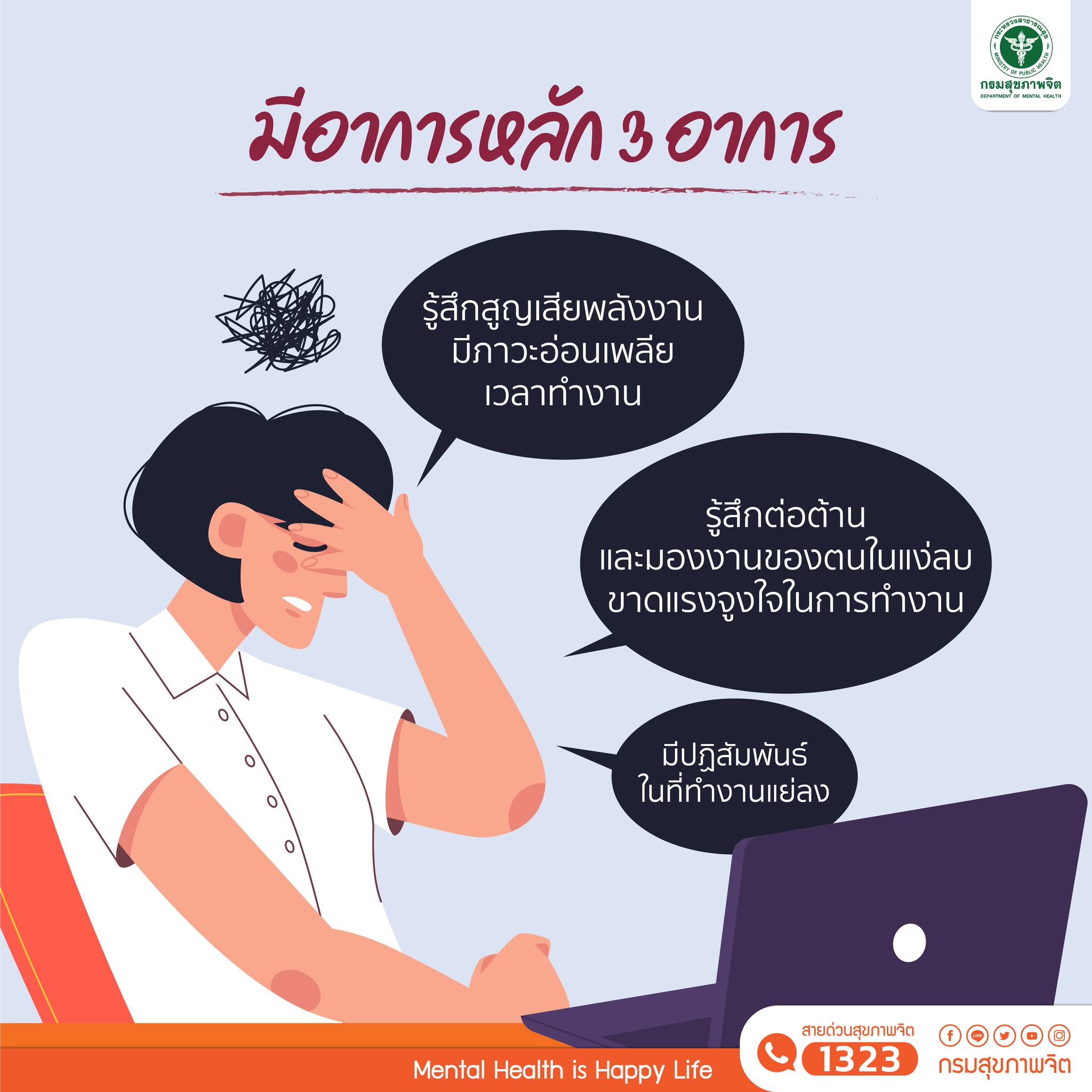ถ้าหากคนทำงานเริ่มมีอาการเศร้า หดหู่ เบื่อหน่ายสิ่งรอบตัว รู้สึกทุกข์ทรมานกับการใช้ชีวิต หรือมีความคิดไม่อยากมีชีวิตอยู่ แนะนำให้ปรึกษาแพทย์หรือผู้เชี่ยวชาญ